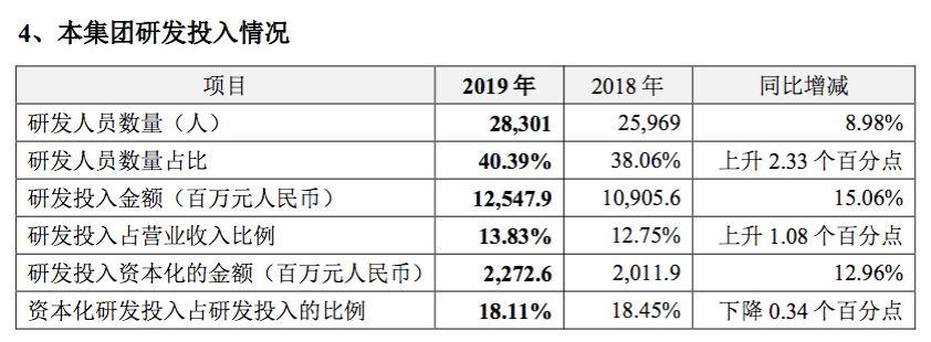 2019年,中兴通讯研发人员数量达到2.83万人次,较2018年同比增长8.98%,研发人员数量占比达到40.39%,研发投入金额为125.48亿元,较上年同期增长15.06%,研发投入占营业收入比为13.83%,较上年同期增长1.08%。