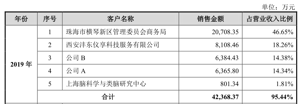 2019年,前两大客户为珠海市横琴新区管理委员会商务局和西安沣东仪享科技服务有限公司,第三大客户为公司B,公司A(华为)退居第四大客户,第五大客户为上海脑科学与类脑研究中心。