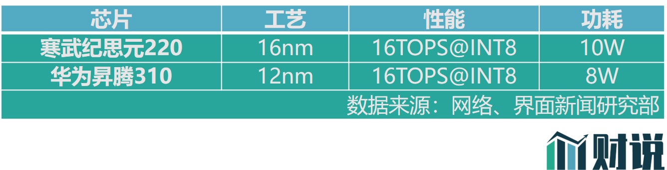 用寒武纪最新的边缘侧智能芯片思元220对比华为昇腾310,性能基本相同情况下,思元220功耗为10W,而华为昇腾310为8W。
