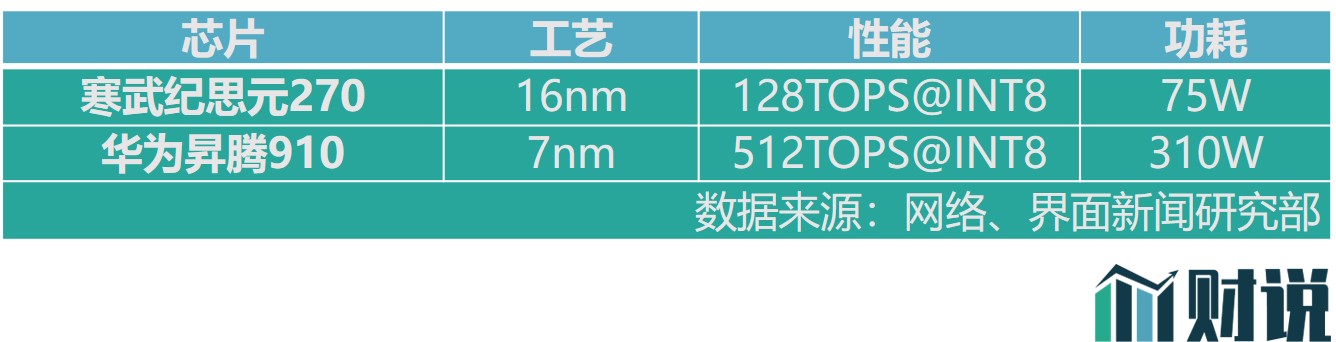 工艺方面,昇腾910采用了7nm工艺,思元270采用了16nm工艺,根据招股书,寒武纪要在其下一代产品思元290上才会采用7nm工艺,目前该产品还处在内部测试阶段;性能方面,思元270在INT8的运算精度下,运算速度为128TOPS,1TOPS代表处理器每秒钟可进行一万亿次运算,昇腾910在INT8的运算精度下,运算速度为512TOPS;功耗方面,思元270为75W,昇腾910为310W。