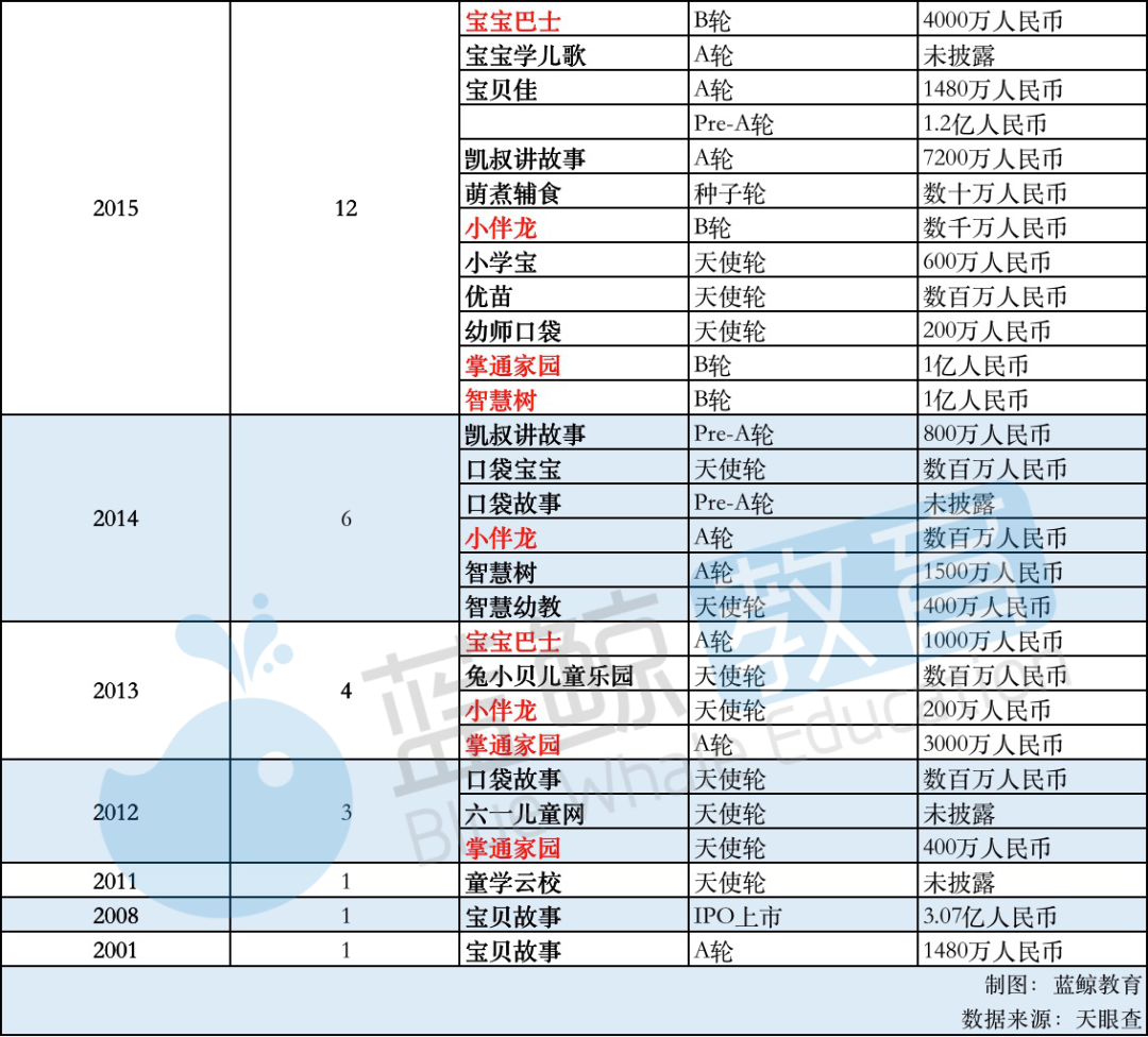 每一家上榜或者出局的活跃儿童教育APP,背后一定免不了资本的运作,背后又有哪些资本玩家呢?蓝鲸教育智库联合天眼查,不完全统计了400多个活跃儿童教育APP的历史融资情况,最早的融资事件可以追溯到2001年,“宝贝故事”A轮融资。