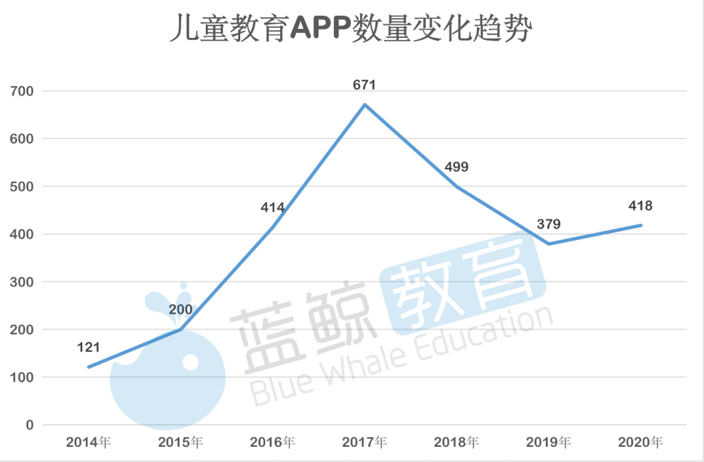 再结合下面近几年儿童教育APP数量变化,儿童教育APP数量也呈现先上升后下降趋势,2017年达顶峰671个,2019年下降至379个,2020略有回升,达418个。