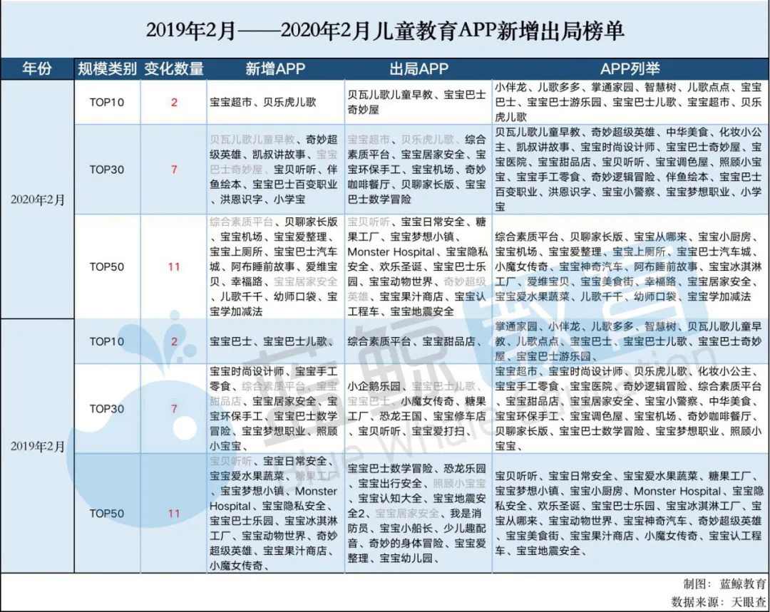 为了更好的观察儿童教育领域APP的发展趋势,结合易观千帆数据,蓝鲸教育智库按照时间跨度,追踪三年时间内,儿童教育活跃APP用户规模榜单的变化,下面是2019年2月至2020年2月,TOP 10、TOP 30、TOP 50的位次变动APP榜单,标灰的APP表示从上一梯队出局进入到下一梯队,并不算做新增。