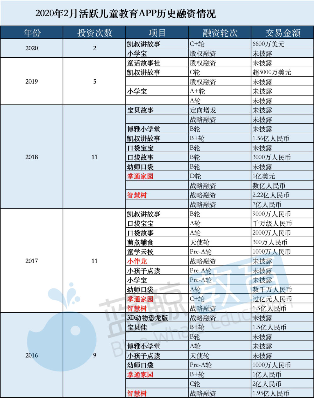 下图是从2001年到2020年儿童教育APP的具体历史融资情况。标红的APP为2020年2月用户规模TOP 10榜单的项目: