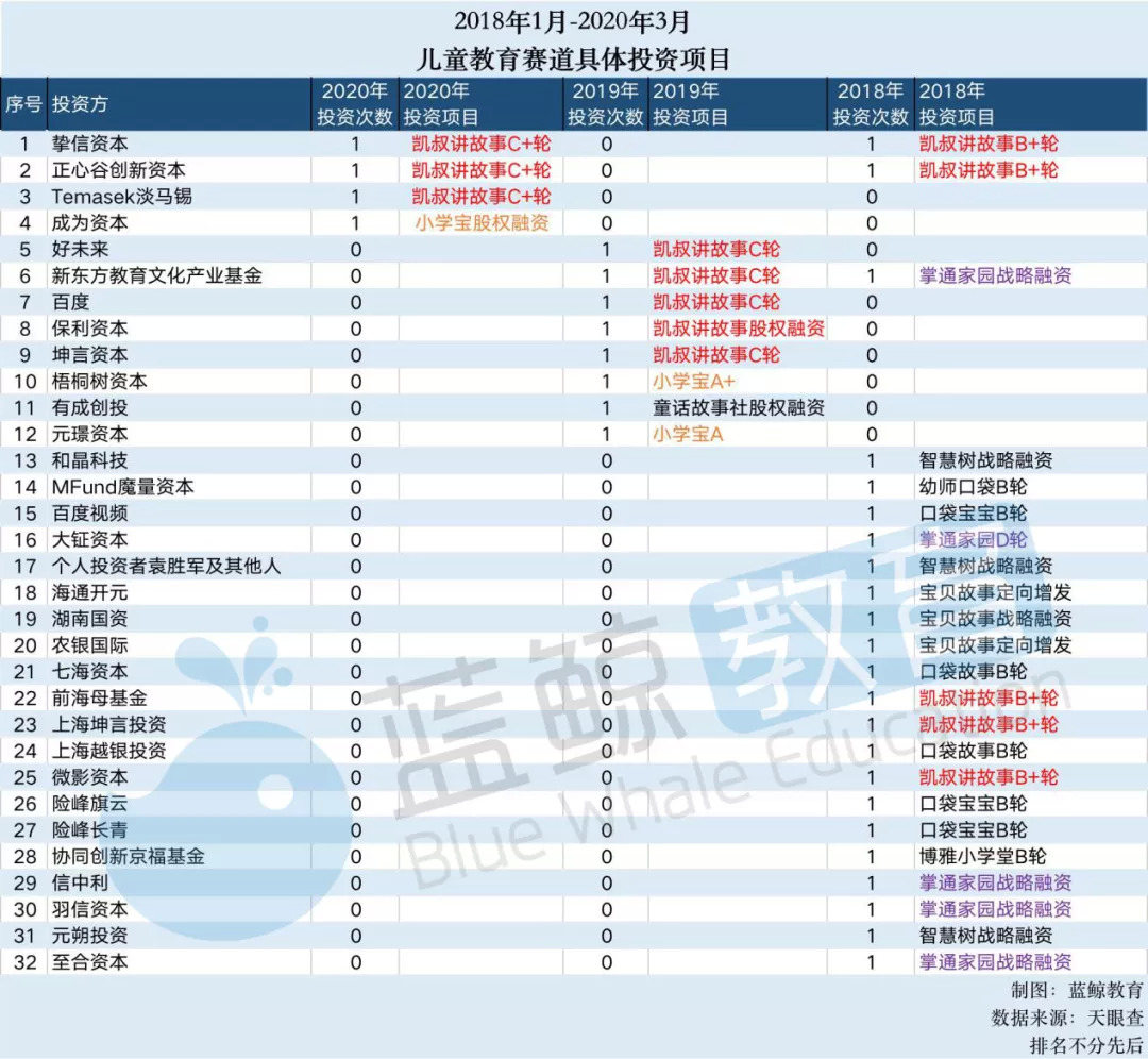 根据以上具体融资事件,我们重点关注一下最近两年内儿童教育赛道的活跃玩家有哪些,且分别布局了哪些资本项目?由于2020年第一季度还未结束,时间跨度从2018年1月末开始,下面是表“2018年1月——2020年3月儿童教育APP赛道具体投资项目”: