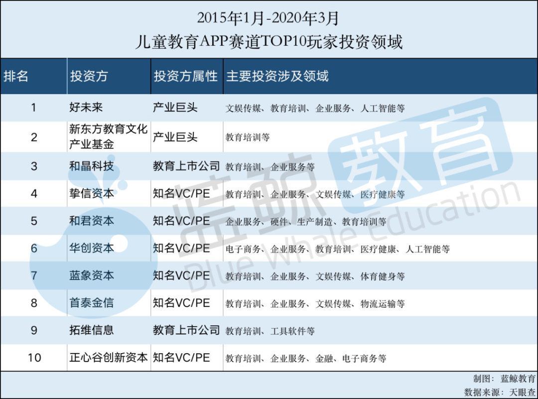 儿童教育APP赛道TOP 10活跃玩家分别有:好未来、新东方教育文化产业基金、和晶科技、挚信资本、和君资本、华创资本、蓝象资本、首泰金信、拓维信息、正心谷创新资本。主要由知名VC/PE、产业巨头、教育上市公司组成。