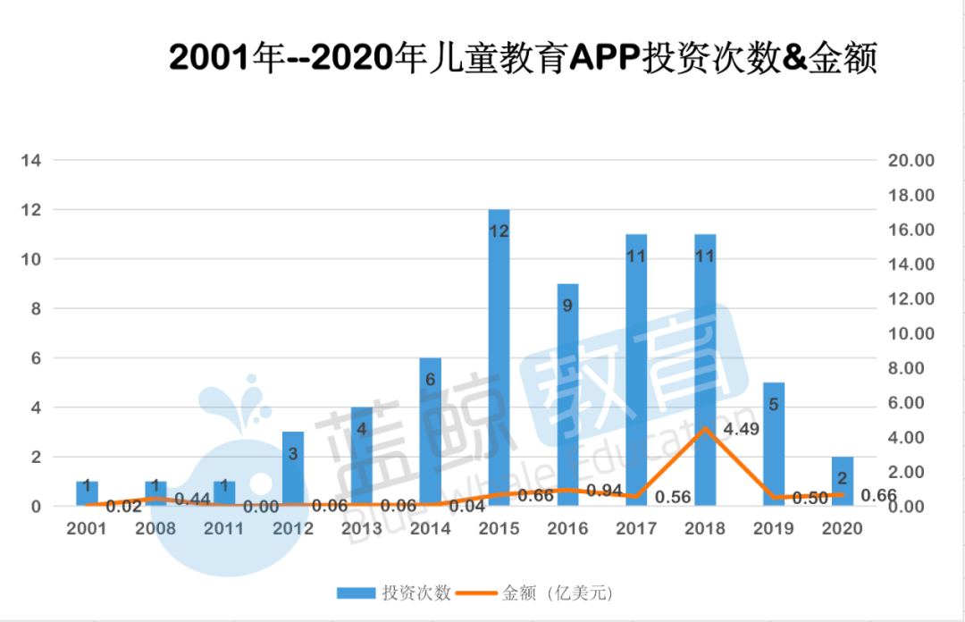 接着,蓝鲸教育智库梳理出每年具体的投资次数以及投资金额(未披露不计入统计),绘制如下图表“2001月--2020年月儿童教育投资次数&金额”: