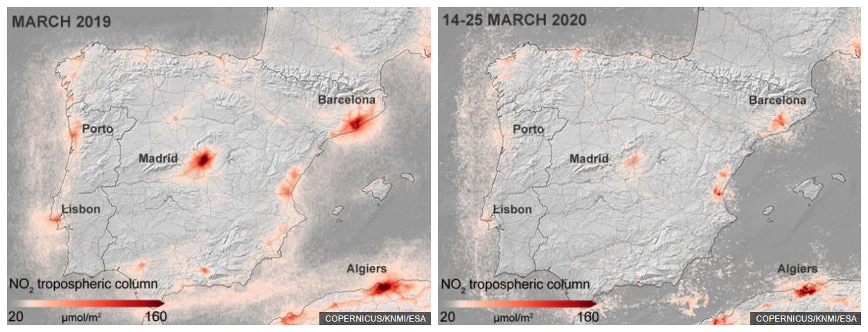 荷兰皇家气象研究所(KNMI)将欧洲多地3月14日至25日空气污染物二氧化氮(NO2)的浓度与2019年3月的月平均浓度进行了比较。这种物质能损害人的呼吸道,对自然环境产生负面效应。人类经济活动产生的二氧化氮主要来自高温燃烧过程的释放,如机动车尾气、锅炉废气的排放。