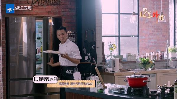 再看看《十二道锋味》,卡萨帝硬性植入的标示就少得多,更多的是通过一些日常的内容软性融入。比方说,在谢霆锋做饭时,你能看到背后的“锋味厨房”整体布局设计,其实就是卡萨帝专为节目定制设计的。