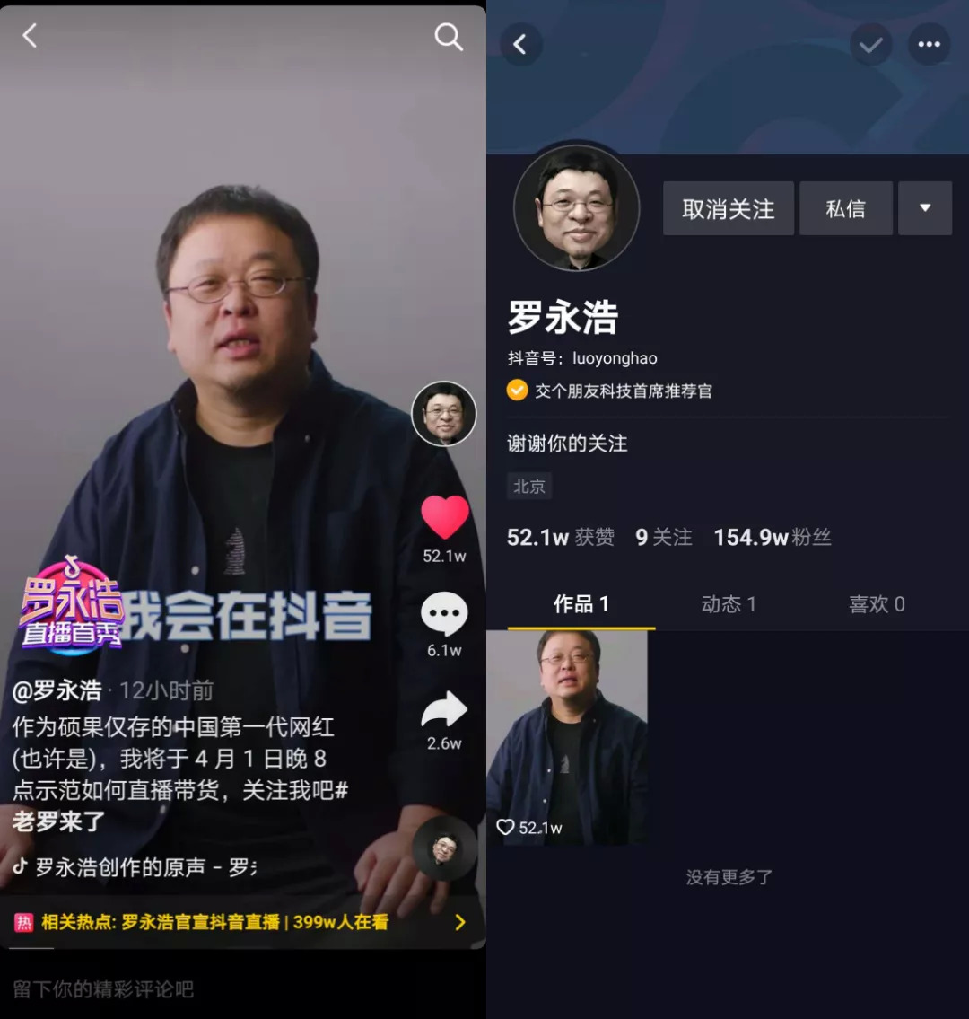 3月25日下午,罗永浩已悄悄入驻抖音并进行“交个朋友科技首席推荐官”的认证,提前揭晓了答案。我在25日晚10:36分时候看罗永浩抖音账户在没有任何内容的状态下,粉丝已达5.3万,在26日早上10:52分时候粉丝已经涨到31.5万;而在3月26日晚上10点40分时,罗永浩粉丝已经达154.9万,罗永浩的铁粉正在快速集结。