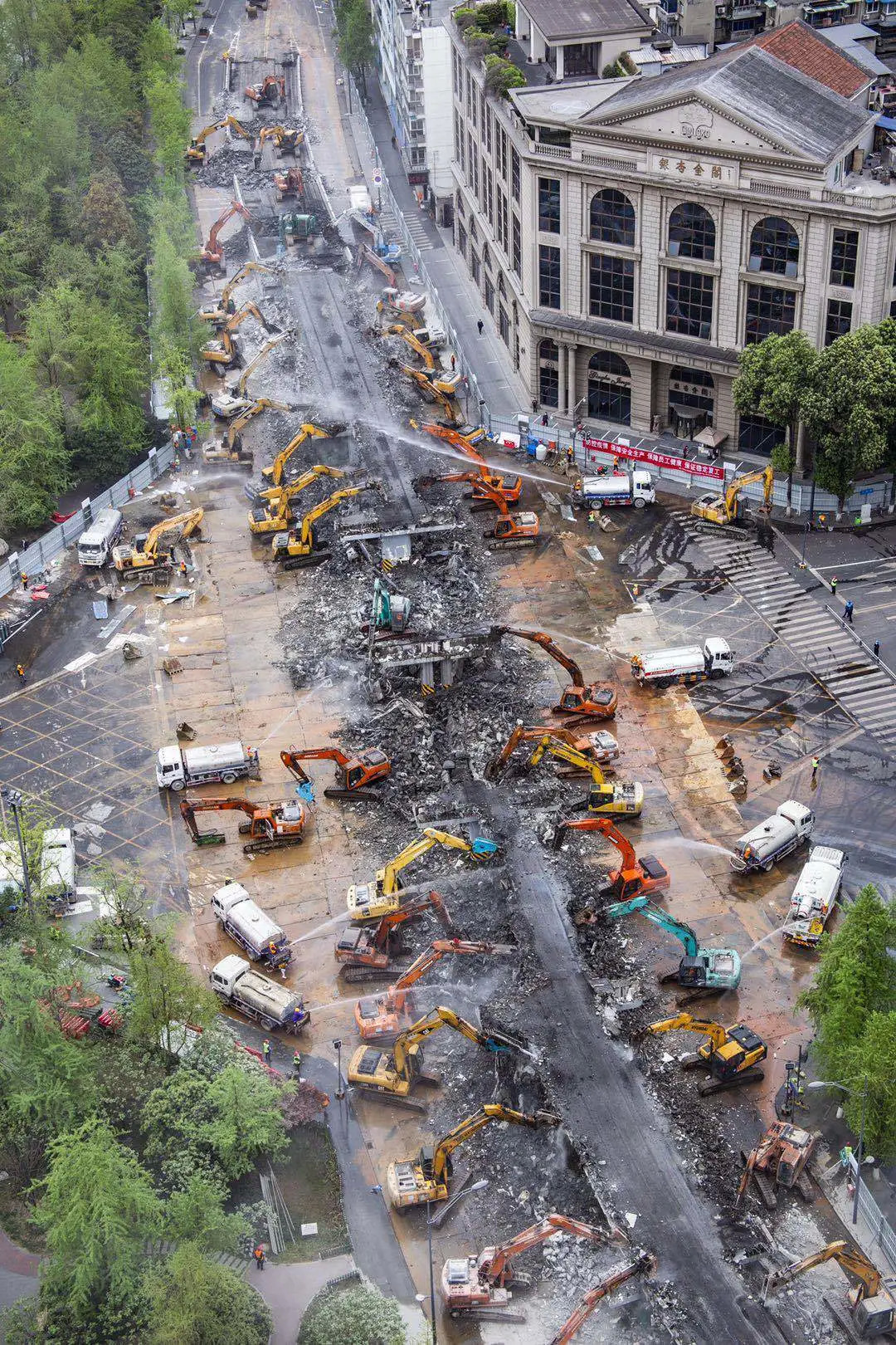 对讲机一声号令,332人齐开动,53台液压破碎机及100余台配套机械设备同时启动,拆除施工正式开始。
