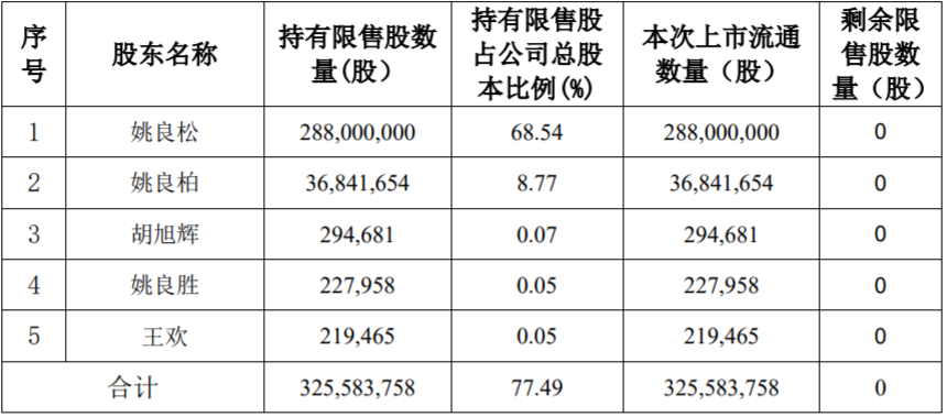 此次解禁欧派家居共涉及的股东5分,均为自然人股东,分别为欧派家居控股股东姚良松及其一致行动人姚良柏,此外还有胡旭辉、姚良胜和王欢。其中,姚良松占此次解禁比例的88%。