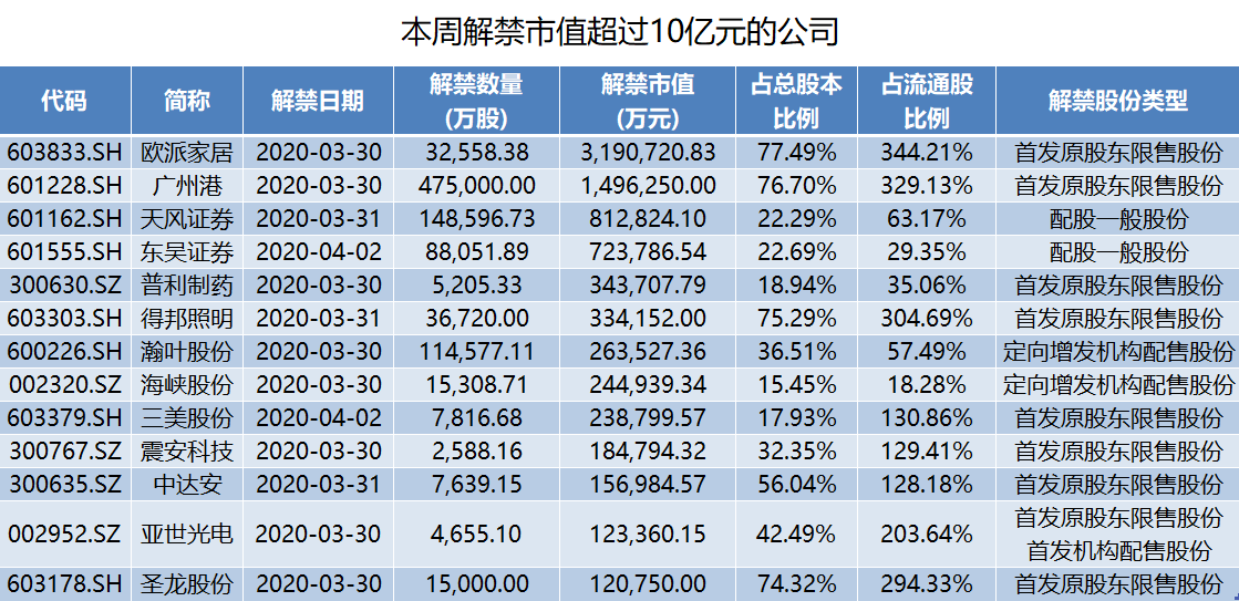 解禁市值超过10亿元的上市公司合计有13家,欧派家居、广州港两家公司解禁市值超过100亿元,天风证券、东吴证券(601555.SH)两家解禁市值超过70亿元。