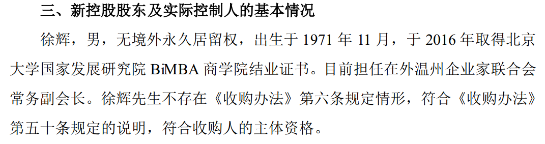 如此一来,安控科技的实控人发生变更,变更为徐辉。材料显示,徐辉,出生于1971年11月,于2016年取得北京大学国家发展研究院BiMBA商学院结业证书,目前担任在外温州企业家联合会常务副会长。伴随着委托,俞凌还将部分股份转让给徐辉。