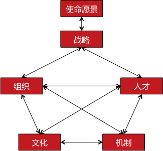 基于最优管理实践和组织理论研究的背景下,结合多年的咨询实战经验,我们提出了OD需要关注的系统五角。即使命愿景牵引下的企业发展系统五角:战略、组织、人才、文化、机制。