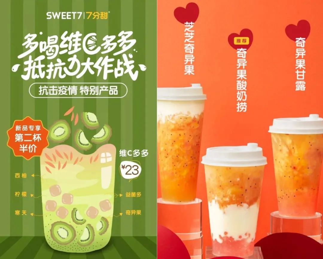7分甜近期两次上新都主打“维C”,第一次上新产品“维C多多”主要有西柚、柠檬、奇异果与益生菌,多种水果的组合意在强调营养更加丰富。第二次上新奇异果系列产品,主要特点是红心奇异果,在7分甜的官微介绍中,红心奇异果更多维C,更多甘甜。