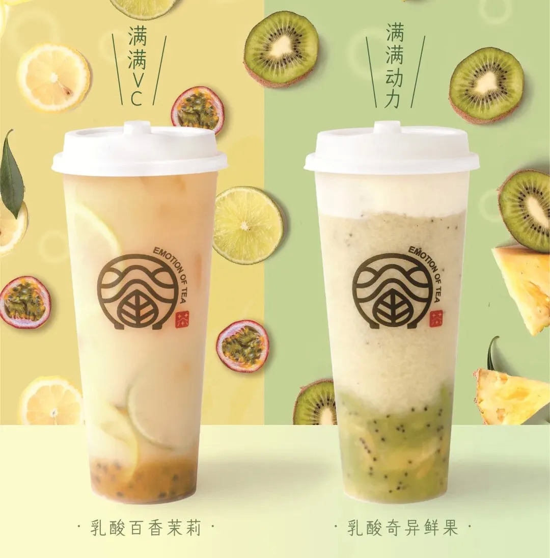 眷茶全新养乐多系列包含乳酸百香茉莉、乳酸奇异鲜果两款产品,养乐多打底,富含维C的水果加持。