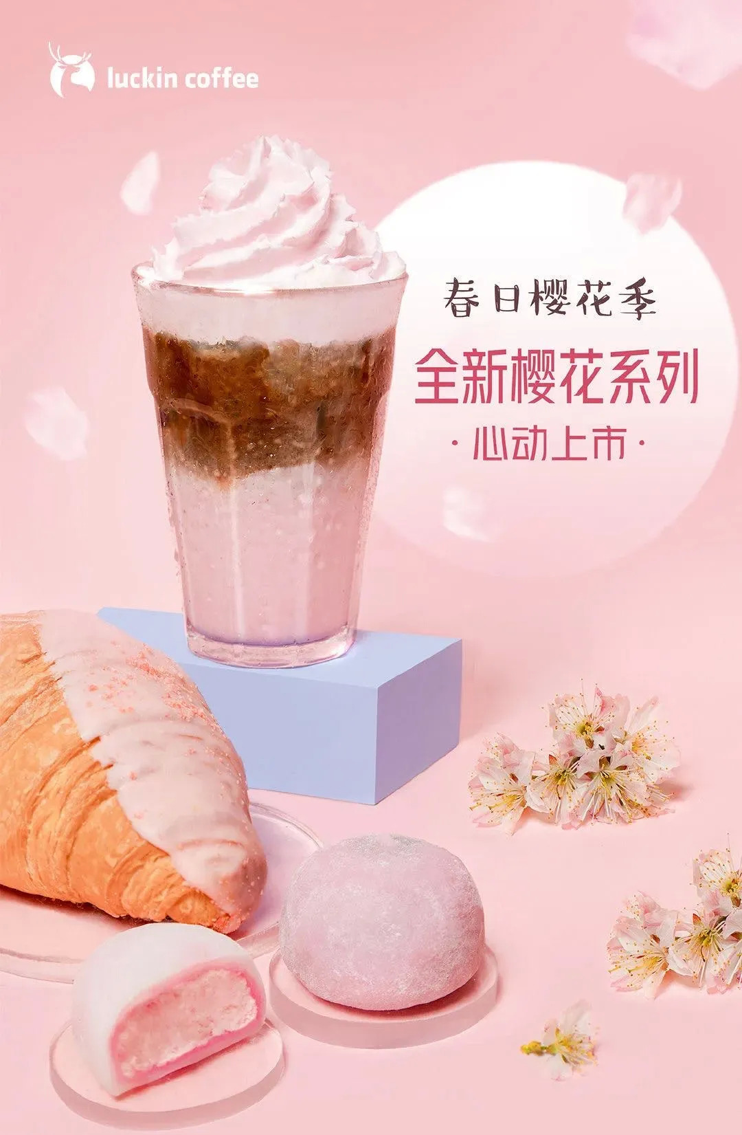 瑞幸咖啡也来加入“樱花热”,推出春日樱花季,全新樱花系列上市。此次樱花系列,包括一款结合樱花风味与咖啡香气的珞珈樱花拿铁,两款春樱大福(其中一款樱花风味),以及樱花味草莓流心羊角。