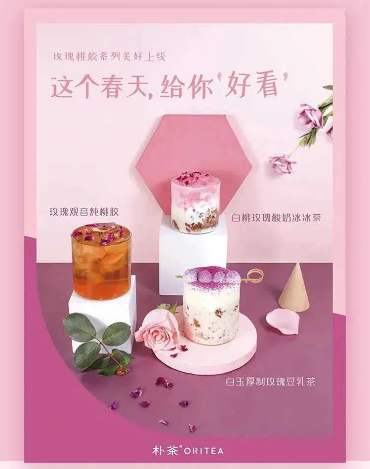 朴茶上线三款玫瑰桃胶系列新品,用可以食用的玫瑰,加以蜂蜜手工熬制成酱,搭配桃胶。