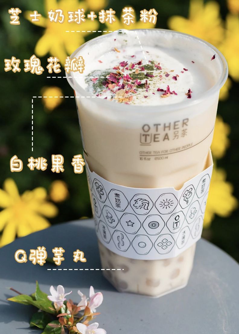 OT另茶极桃芋丸奶茶,香浓芝士奶球搭配抹茶粉,再添加上玫瑰花瓣。