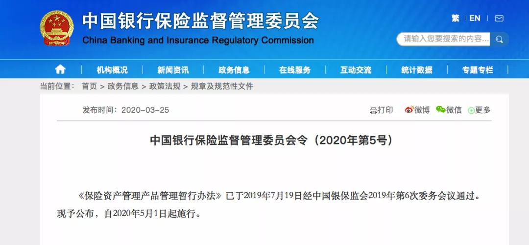 银保监会3月25日公布《保险资产管理产品管理暂行办法》,自2020年5月1日起施行。