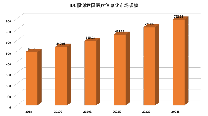 2019年5月,IDC在新发布的《中国医疗行业IT市场预测,2019-2023》报告中修正了预测。2018年中国医疗行业的IT花费实际达到了491.8亿元,比之前的预测高了36.6%。因此,IDC重新预测认为医疗信息化市场在2018至2023年的年复合增长率将为10%,按照这一预测,2019年我国医疗信息化市场规模将在540亿元左右,到2023年该市场规模将达到791.6亿元。
