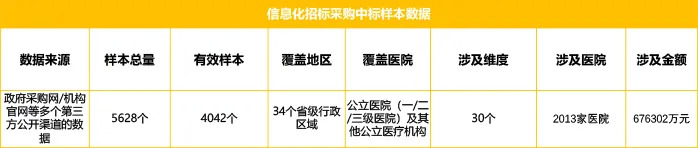 我国公立医疗机构属于事业性单位,根据《中华人民共和国政府采购法》,政府机构可以通过公开招标、邀请招标、竞争性谈判、单一来源采购、询价和国务院政府采购监督管理部门认定的其他采购方式进行采购行为,但公开招标应作为政府采购的主要采购方式。同时,样本涉及金额预估2019年医疗信息化市场规模(580.67亿元)的10%强,数据样本足够大,能够反映出医疗信息化市场的基本情况,具有相当的代表性,但动脉网并不保证其全面性。