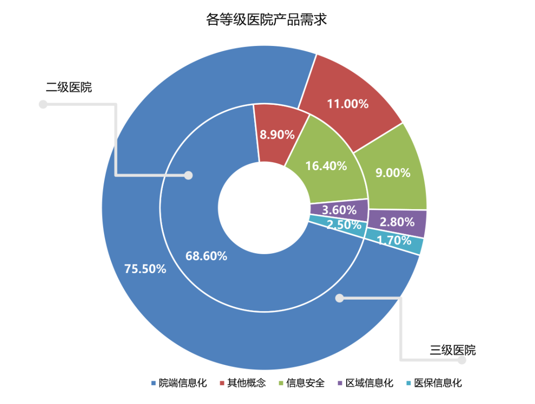 根据我们对不同医院等级及其采购信息化产品的交叉统计,可以发现二级医院与三级医院在部分项目上有着明显的区别。其中,最为明显的莫过于信息安全项目所占比例的不同。