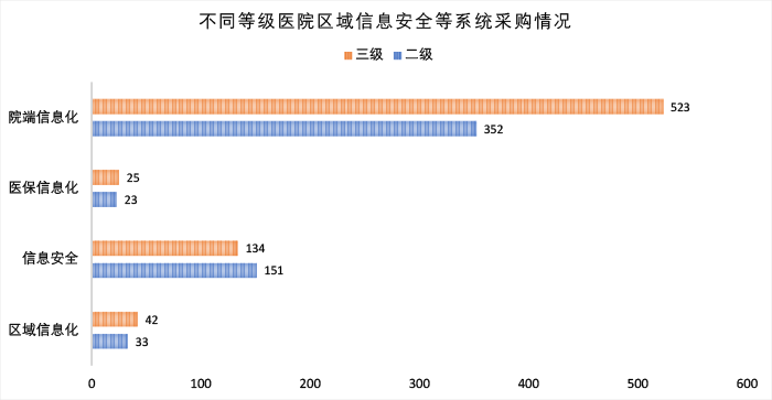 在医保信息化系统采购数目上,三级医院和二级医院的差异不大,显示出医保信息化这种刚需系统对不同等级医院并不敏感。由于三级医院需要更多地在区域信息化系统中承担主要责任,三级医院的区域信息化招标数目也比二级医院更多。在院端信息化部分,三级医院就明显更多了,这也与三级医院更为重视信息化建设,也有更多资源投入信息化建设的现状相符。如前所述,因为等保测评的缘故,二级医院采购信息安全系统的数量也更多,这也是二级医院极少数采购数量压倒三级医院的信息化系统。