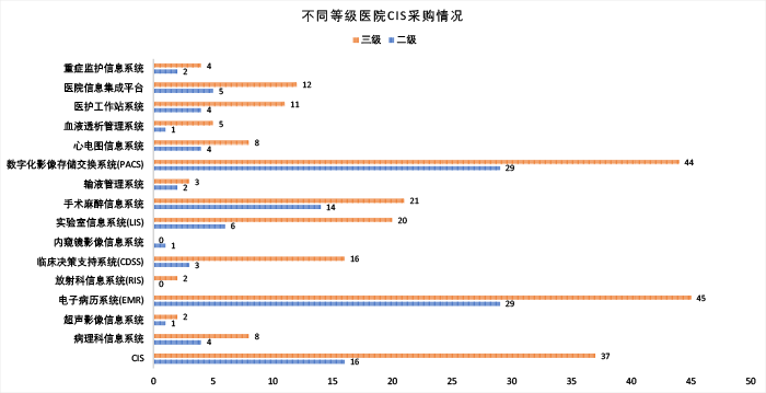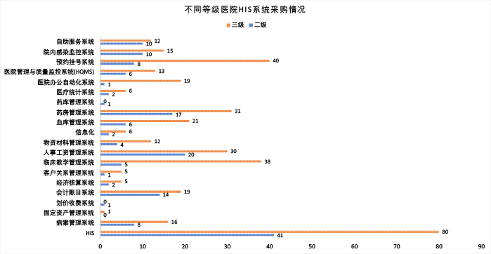 在HIS系统部分不同等级医院显示出了明显的差异。二级医院除了在自助服务系统、会计账目系统等少量系统的采购数量上接近三级医院外,大部分都远落后于三级医院。在预约挂号系统、医院办公自动化系统、临床教学管理系统和客户关系管理系统上,三级医院的采购数量分别是二级医院的5倍、19倍、7.6倍和5倍。以预约挂号系统为例,目前,三级医院普遍可以通过微信等方式在线预约挂号,极大地缓解了挂号难的问题。这显示出了二三级医院在信息化水平上的巨大差异,也说明了二级医院信息化建设巨大的市场空间。