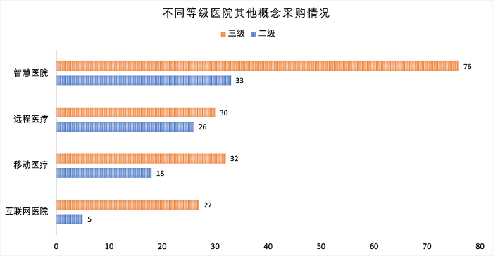 在其他概念的招标采购中,二三级医院仍然差距巨大。其中,差距最大的是互联网医院——三级医院在互联网医院上的招标数量是二级医院的5.4倍。二三级医院招标项目数量唯一较为接近的是远程医疗,二级医院只比三级医院少4个。