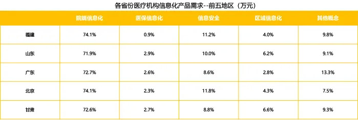 根据我们之前的统计,各省份的医疗信息化采购项目中,根据项目数量来划分,前五位分别是福建、山东、广东、北京和甘肃。那么,这些采购数量排名前列省份的医院在选择信息化产品上会有什么样的分布呢?