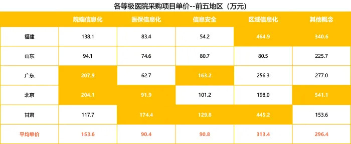 甘肃在医保信息化、信息安全和区域信息化的单价上都进入了前2的水平,与北京一样有3项,让人颇为意外。尤其在医保信息化和区域信息化上,其项目单价水平比其他前5省份高出一大截。无论是医疗资源还是医疗信息化建设,甘肃都相对落后,作为刚需的医保信息化单价较高可能说明当地在补齐之前的短板。同时,地广人稀的特点也使得发达地区的经验在甘肃未必适合,这大概是当地更侧重于区域信息化建设的原因之一。