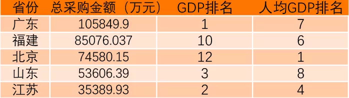 省份经济与医疗信息化水平究竟有多大的关联?我们从国家统计局查询了各省份2018年有关GDP的公开数据并进行排序,并与统计样本中的采购金额进行交叉比对。