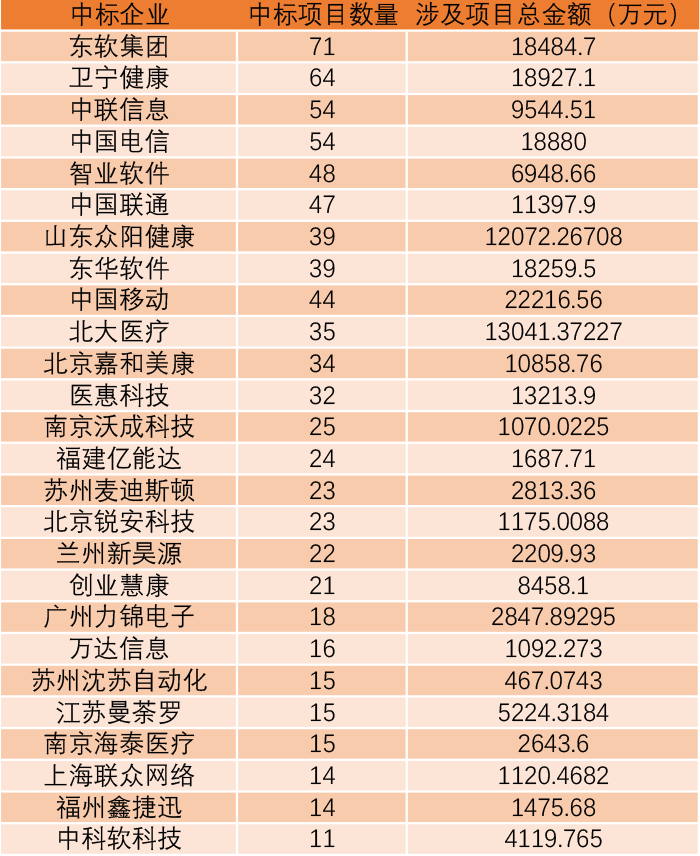 如果排除掉中国移动和中国电信两家通信运营商,卫宁健康将是涉及金额排名第一的企业,随后则是东软集团(18484.7万元)和东华软件(18259.5万元)。其中,东华软件仅以39个项目实现18259.5万元的金额,高达486.19万元的项目单价甚至不逊于通信运营商,显示了较高的项目含金量。