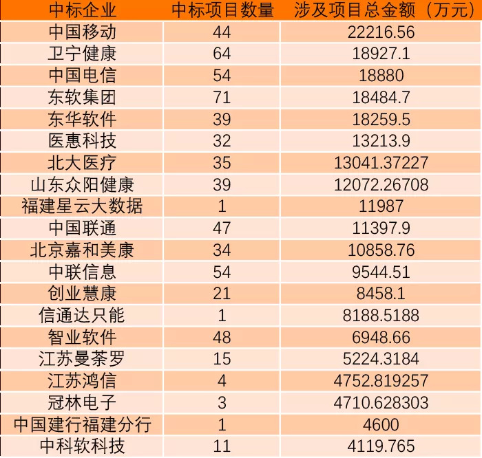 在涉及金额排名前20位的企业中,排名最高的是中国移动,44个项目涉及金额22216.56万元。与之情况相似的则是中国电信,54个项目涉及金额18880万元。不过,这两家通信运营商中标项目基本都是价值较高且高度集中的通信系统集成,情况较为特殊。排名第二的卫宁健康涉及金额高达18927.1万元。无论以项目数量还是总金额,卫宁健康这家企业都可以进入前二名,显示了老牌医疗信息化企业的底蕴。