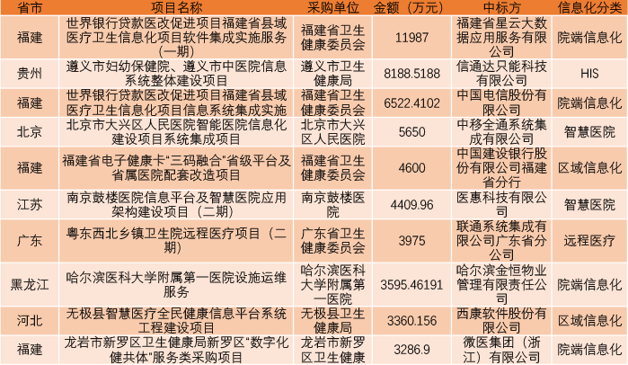 在排名前十的项目中,基本都是卫健委针对当地的打包方案,因此价格较贵。比如,排名第一的是福建省卫生健康委员会招标的“世界银行贷款医改促进项目福建省县域医疗卫生信息化项目软件集成实施服务”,金额高达1.1987亿元。从项目名称来看,该项目显然是针对整个福建省的县域医疗机构实施的信息化项目。总体来看,此类项目占据了前十名中的7位。
