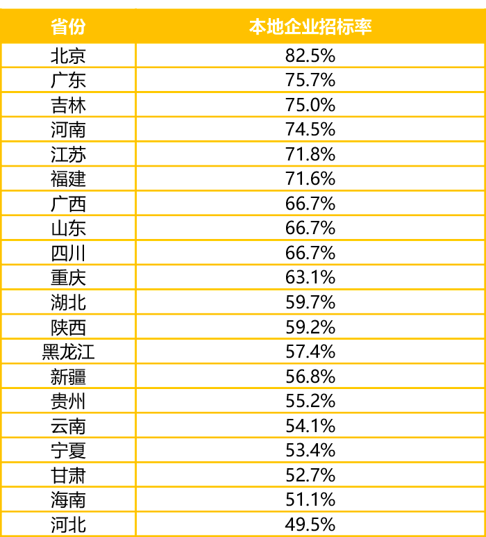河南的信息化企业虽然名气相对较小,但在中标企业分布的排名中也不低,为第8位。这些地区的企业中标率较高也在情理之中。不过,吉林省的中标企业分布比例排名只以1.7%的比例排到了16位,但本地企业招标率却以75%排名第3。这可能说明当地存在较高水平的地域保护。