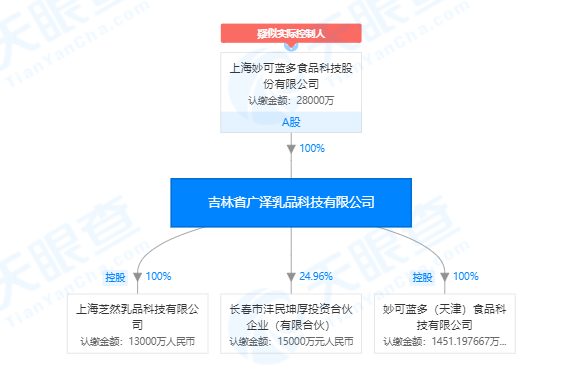 其中,奶酪业务的经营主体为妙可蓝多全资控股的子公司——吉林省广泽乳品科技有限公司(下称广泽乳品)。广泽乳品旗下还有两家全资子公司,上海芝然乳品科技(下称上海芝然)和妙可蓝多(天津)食品科技(下称天津妙可蓝多)也都从事奶酪生产业务。