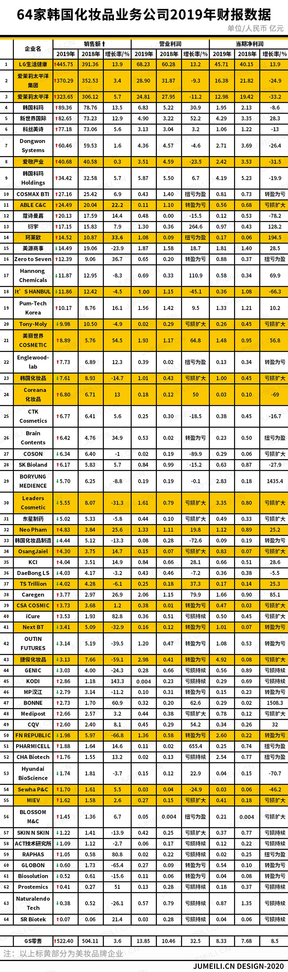 近日,韩国媒体Cosmorning收集并分析了2020开年至今,64家韩国化妆品行业相关企业的2019财年财报数据。