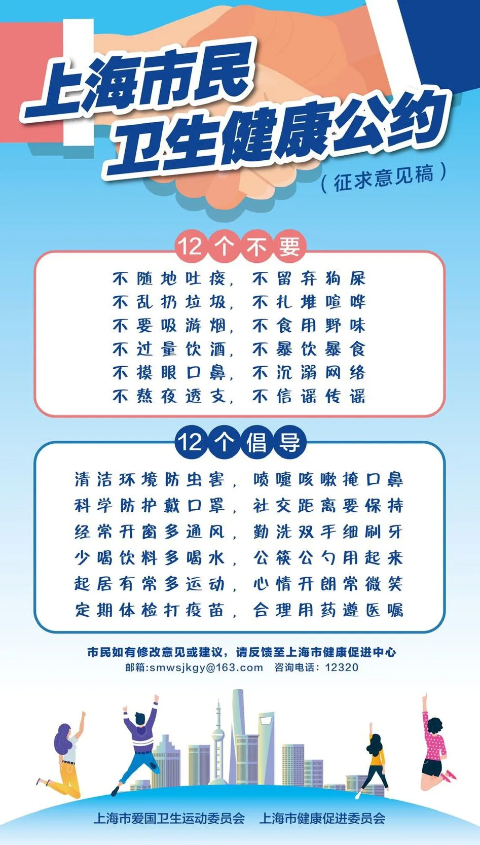 3月30日,上海市卫健委联合市健促办发布《上海市民卫生健康公约》征求意见稿,即日起至4月7日前公开征求市民意见。公约内容分为12个不要和12个倡导,涵盖转变健康理念、改善人居环境、改变饮食习惯、引导文明行为和倡导个人健康生活方式等方面。