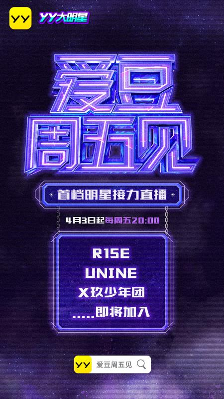 继大张伟、张远、摩登兄弟、曾一鸣等艺人在YY直播形成长期固定直播后,YY直播在明星直播常态化上又有了新突破。3月27日,YY直播宣布推出首档明星接力直播综艺《爱豆周五见》,自4月3日起至5月底的每周五晚八点,中国三大偶像男团R1SE、UNINE、X玖少年团的超高人气偶像将以接力直播形式在《爱豆周五见》的直播间与粉丝进行线上互动。《爱豆周五见》是泛娱乐直播行业首次推出的明星固期直播IP,R1SE、UNINE、X玖少年团也是首次齐聚在同一平台进行直播。