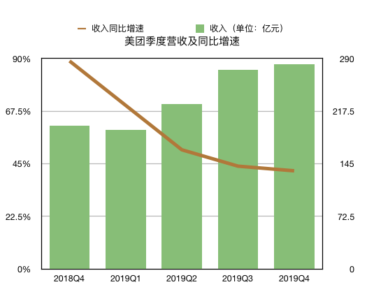 在过去数个季度中,美团的营收同比增速在逐步放缓。从2018年Q4开始,季度营收同比增速分别为89%、70%、51%、44%和42.2%。