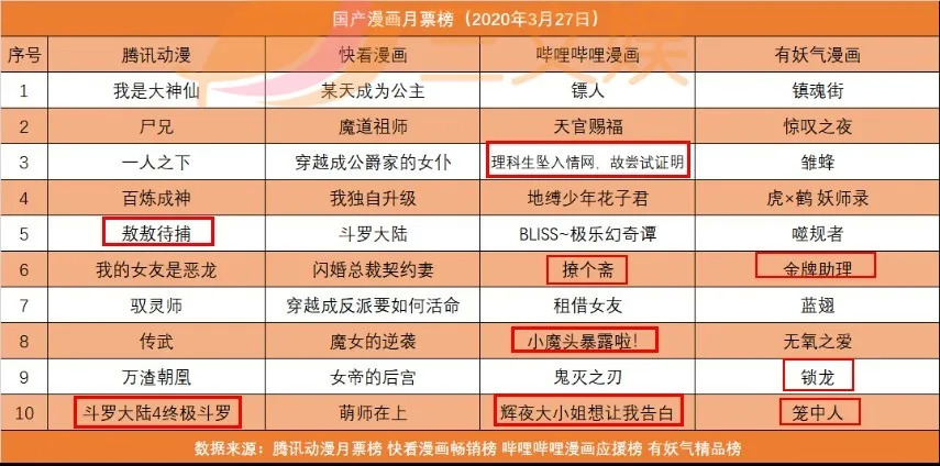 腾讯动漫方面,本周排名榜首的依旧是《我是大神仙》。《我是大神仙》是盛世卡漫出品的玄幻冒险漫画,目前更新到了287话,累计人气71亿,本周收获了2.4万张月票。在月票数量上,《我是大神仙》和《尸兄》遥遥领先其他作品。