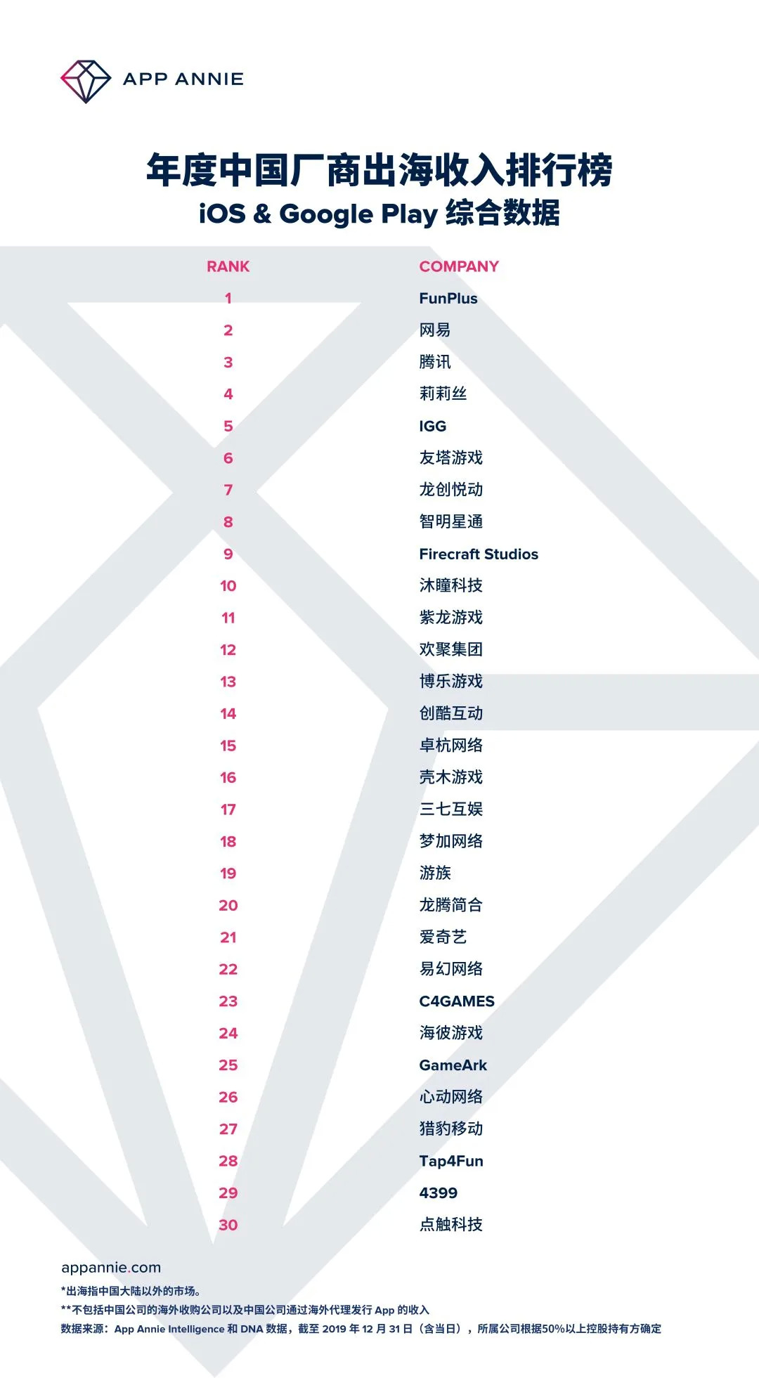 3月24日,数据公司AppAnnie发布了《全球发行商 52 强榜单》、《中国厂商出海下载收入 30 强榜单》和《年度中国厂商出海下载量排行榜》。