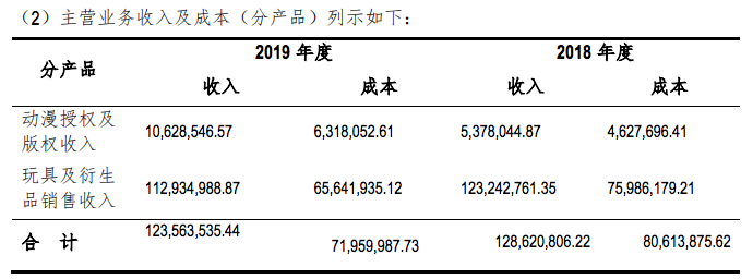 在精英动漫2019年的营收中,动漫授权及版权收入1062.85万元,玩具及衍生品销售收入1.13亿元;其2018年营业收入1.29亿元,其中动漫授权及版权收入550.83万元,玩具及衍生品销售收入1.23亿元。