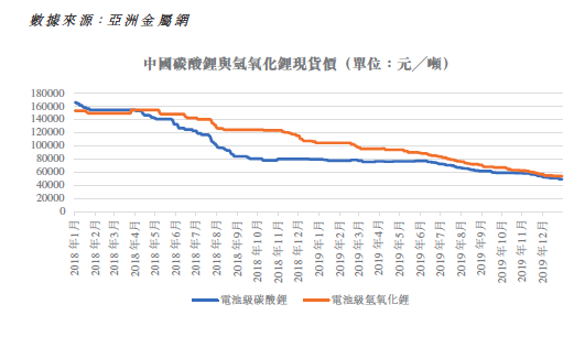 去年1月,中国碳酸锂现货价格为8万元/吨,年末跌至5万元/吨,跌幅达37.5%;氢氧化锂现货价格从去年年初10万元/吨,跌至年末约5.5万元/吨,近乎腰斩。
