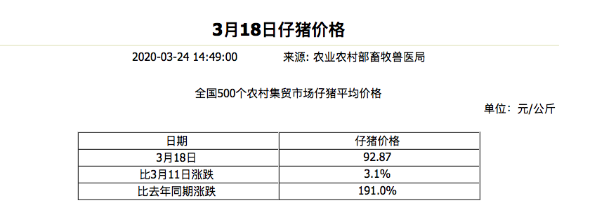 此外,根据农业部数据,截止到3月30日,全国农产品批发市场猪肉平均价格为46.66元/公斤。截止到3月18日,全国仔猪价格为92.87元/公斤,较去年同期上涨191.0%。