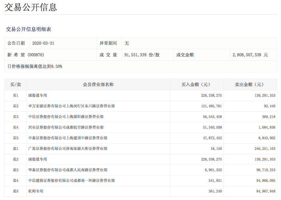 新希望当日成交金额达28.08亿元,日价格涨幅偏离值达到9.50%,其中,深股通专用席位当日买入2.26亿元,位列买入第一席位,同时卖出1.39亿元,位列当天卖二席位。