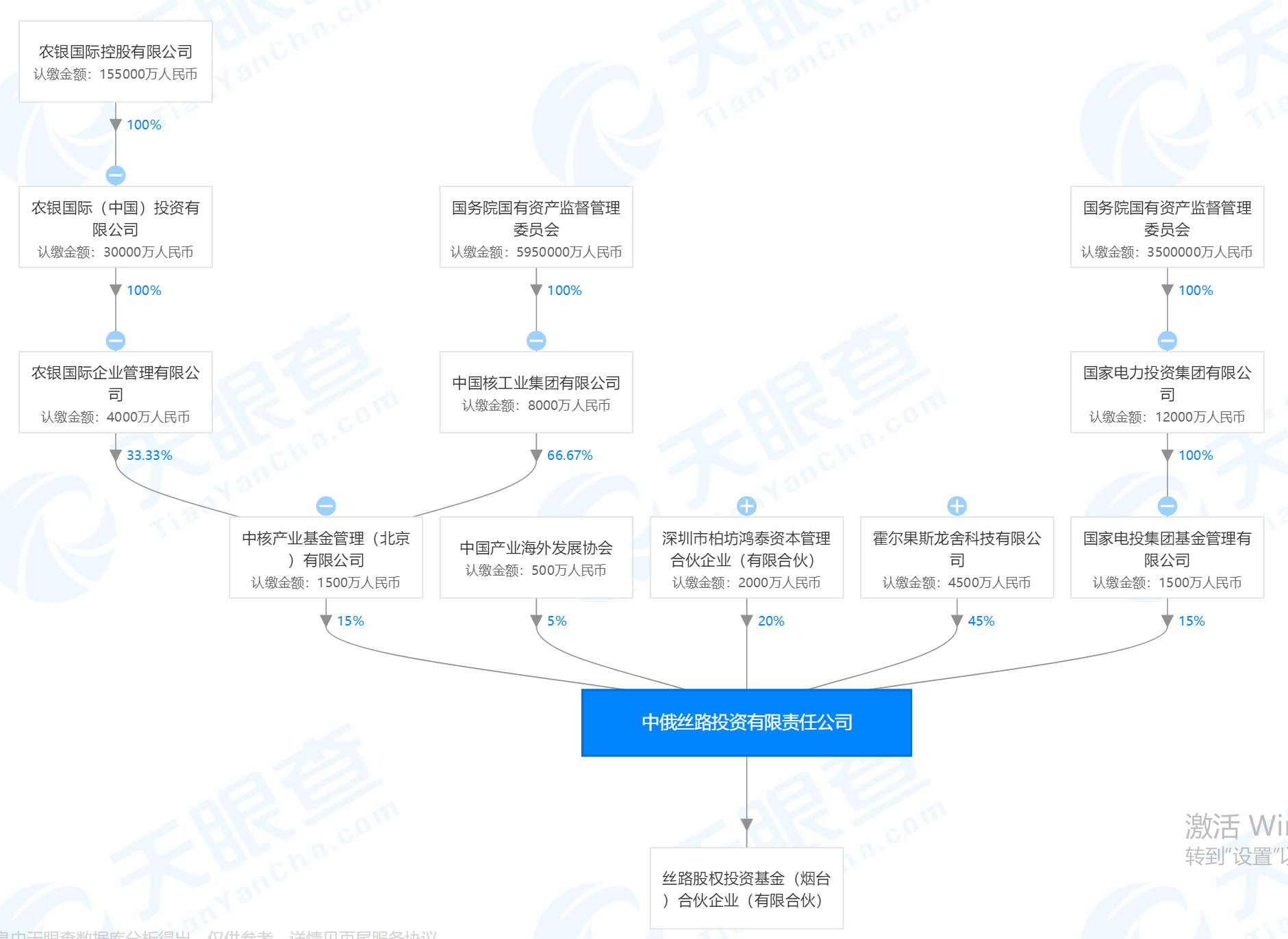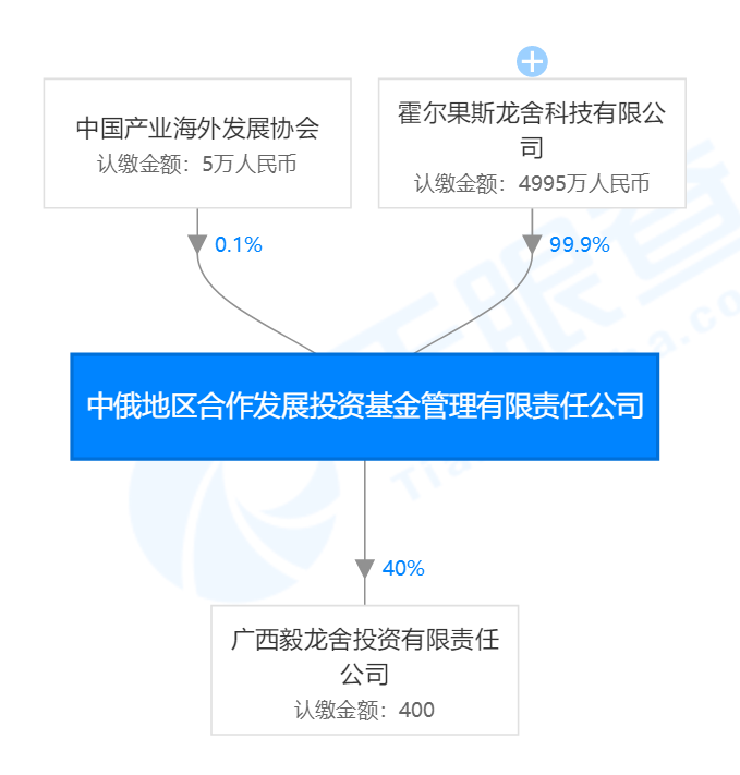 天眼查显示,中俄发展5个发起人有中核产业基金管理(北京)有限公司(持股15%)、国家电投集团基金管理有限公司(持股15%)、中国产业海外发展协会(持股5%)、霍尔果斯龙舍科技有限公司(持股45%)、深圳市柏坊鸿泰资本管理合伙企业(有限合伙)(持股20%)。这其中,中核产业基金管理(北京)有限公司和国家电投集团基金管理有限公司的实控方,是国务院国资委。另一家中俄发展,则由霍尔果斯龙舍科技有限公司持股99.9%。